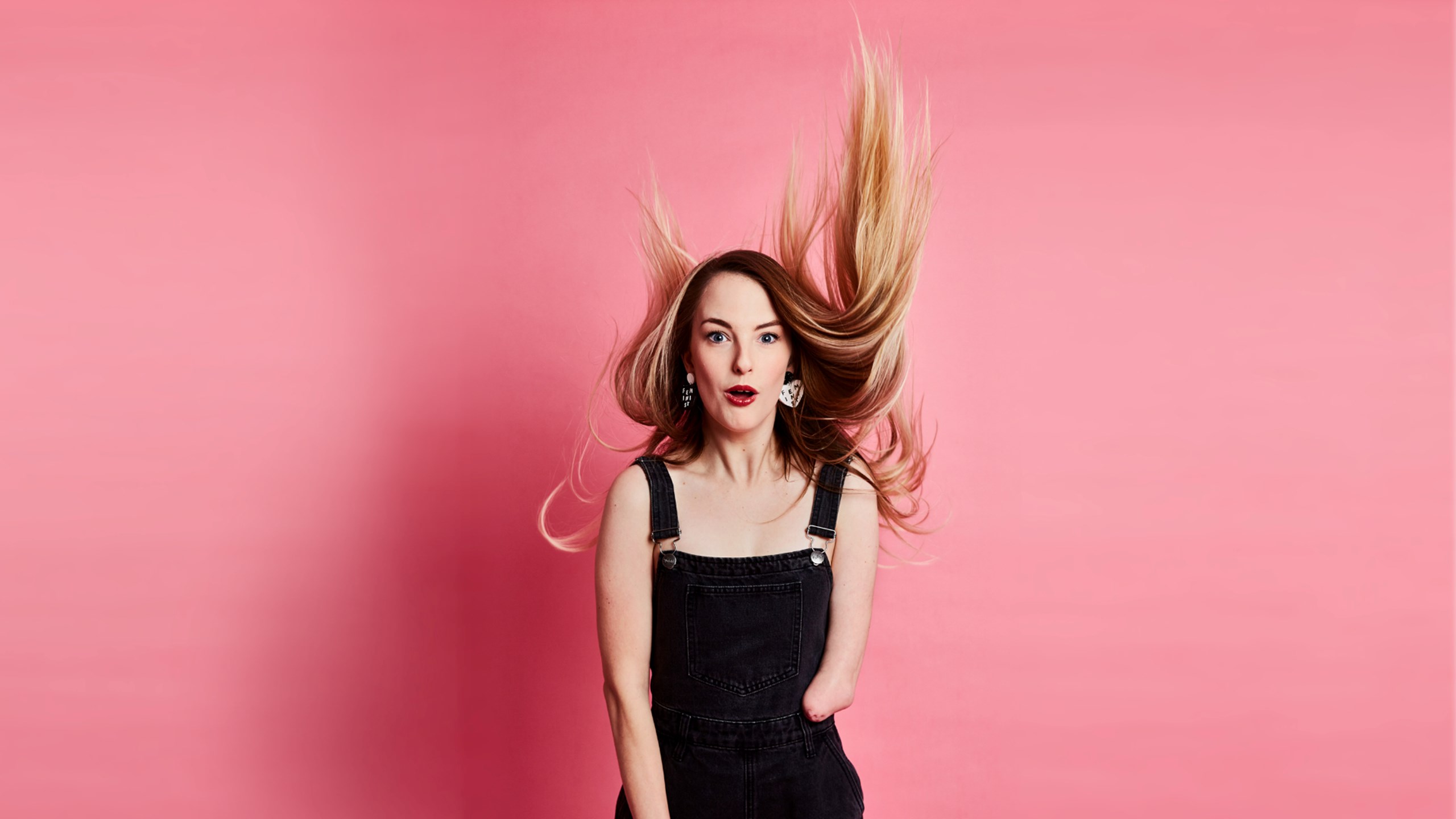 Photo of comedian Madeleine Stewart against a pink background. She is wearing black overalls and her long blonde hair is being comically blown upwards.